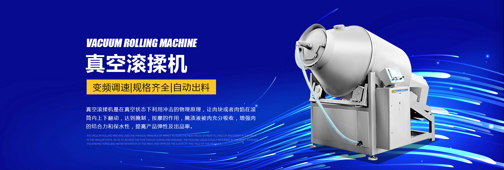 公司主要生產不銹鋼制品食品機械:各種規(guī)格型號真空滾揉機、制冷滾揉機、提升機、電加熱夾層鍋、肉丸機、真空攪拌機、絞肉機、灌腸機、打卡機、線扎機、斬拌機、鹽水注射機、煙熏爐、油炸機、巴氏殺菌線、連續(xù)油炸線、肉丸成型水煮線、醬鹵生產線、肉丸破碎機、真空包裝機、洗袋風干機、豬頭劈半機、不銹鋼火腿模具、肉斗車、案桌、煙熏車、屠宰類機械設備、清洗風干設備、肉類解凍設備、滾筒拌料機等。產品廣泛適用于火腿腸、肉丸、肉串、鹵制品、海產品、禽類深加工、油炸、泡椒風味、速凍水餃、魚豆腐、千葉豆腐、豆腐干、牛肉干、牛排雞排類、禽蛋、麻辣、休閑、水果蔬菜清洗、中央廚房、餐飲連鎖、寵物食品等食品生產。